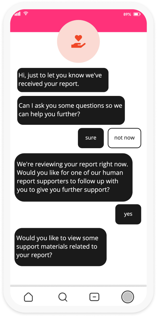 iMatter provides a chat interface to support users through the reporting process. iMatter is accessed from the homepage where the chatbot states that a report has been received. When clicked, a chat opens and guides the user through the status of their report and offers resources such as community support, and the opportunity to chat with a psychologist. A follow-up conversation checks how the user is doing, asks if they need further support, and offers the option to leave feedback about their experience of the reporting process.