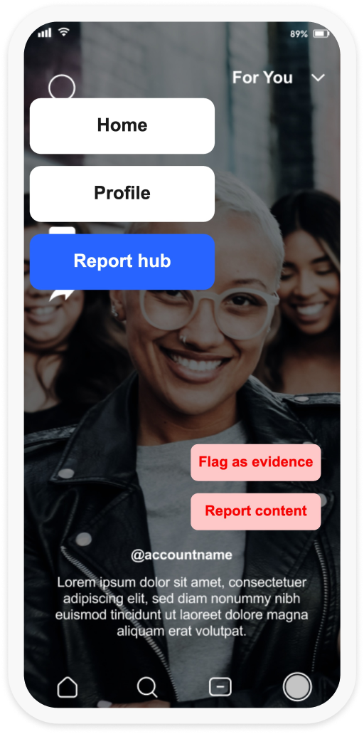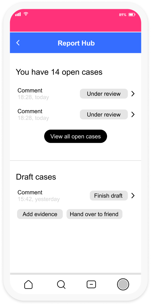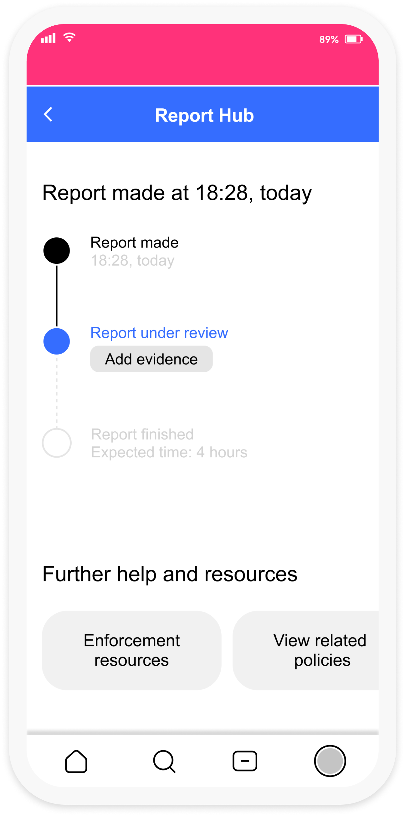 Report Hub provides a reporting dashboard that allows users to track the status of all their reports using key milestones on a timeline - for example, ‘report made’, ‘report under review’, ‘review complete’, ‘decision appealed’. The timestamps help the user understand the timeline of the process. The feature is accessible from the homepage at all times. Users also have the option to save draft reports, add further evidence, or even hand over the report to a trusted contact if they are feeling overwhelmed.